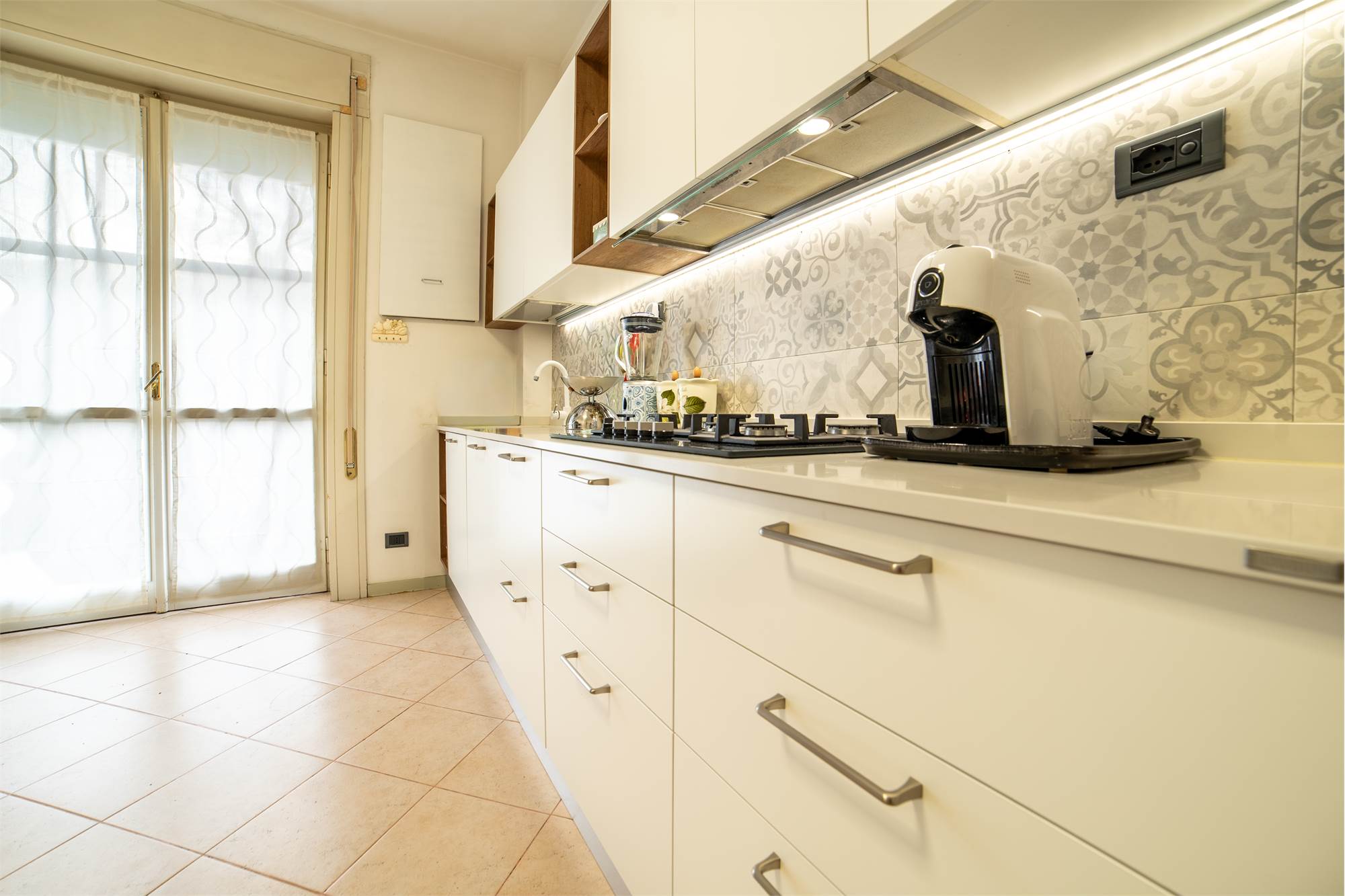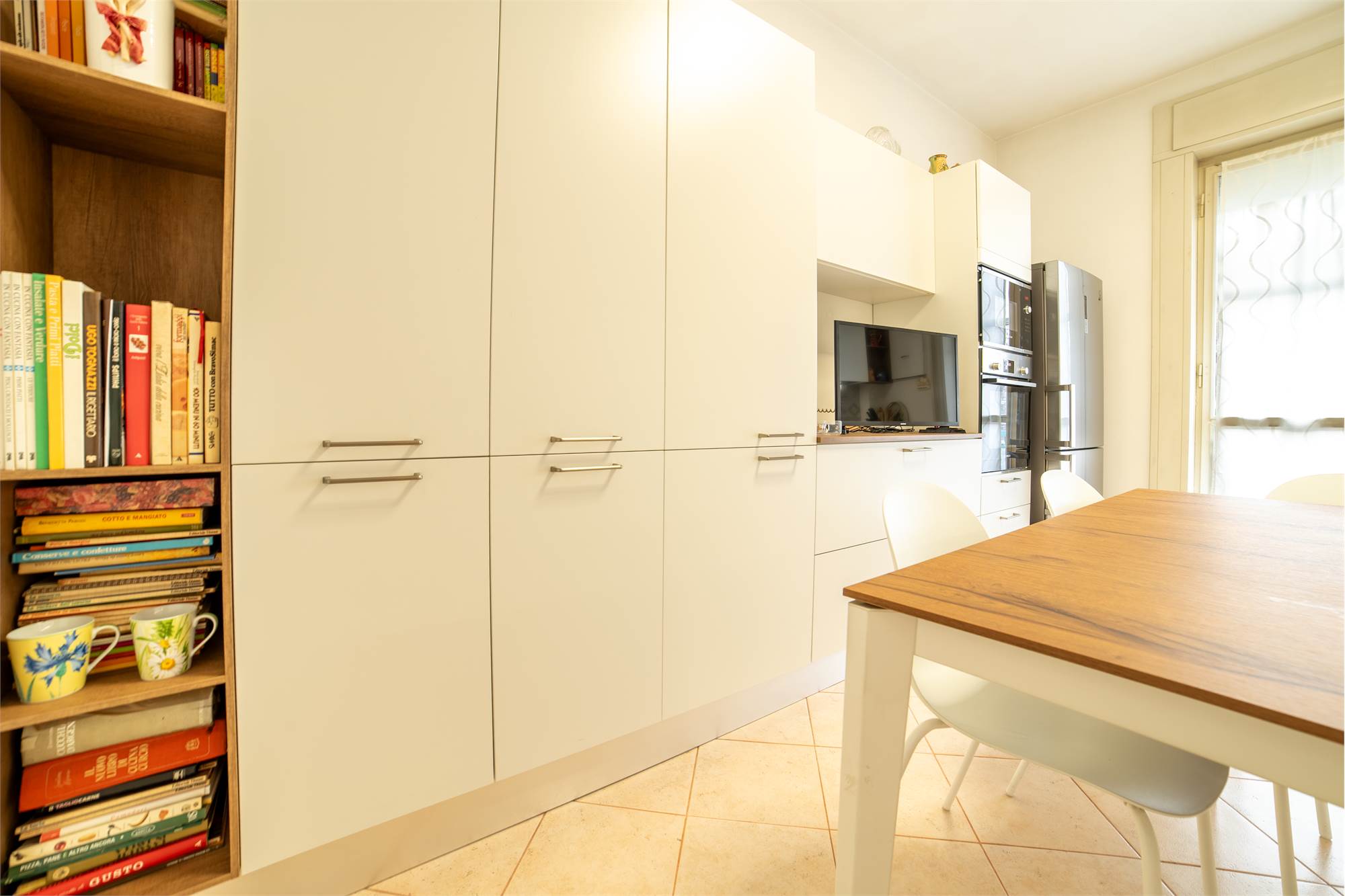 La cucina è abitabile, moderna e ben organizzata, con accesso diretto al balcone dotato di funzionale tenda elettrica, un plus particolarmente ricercato.