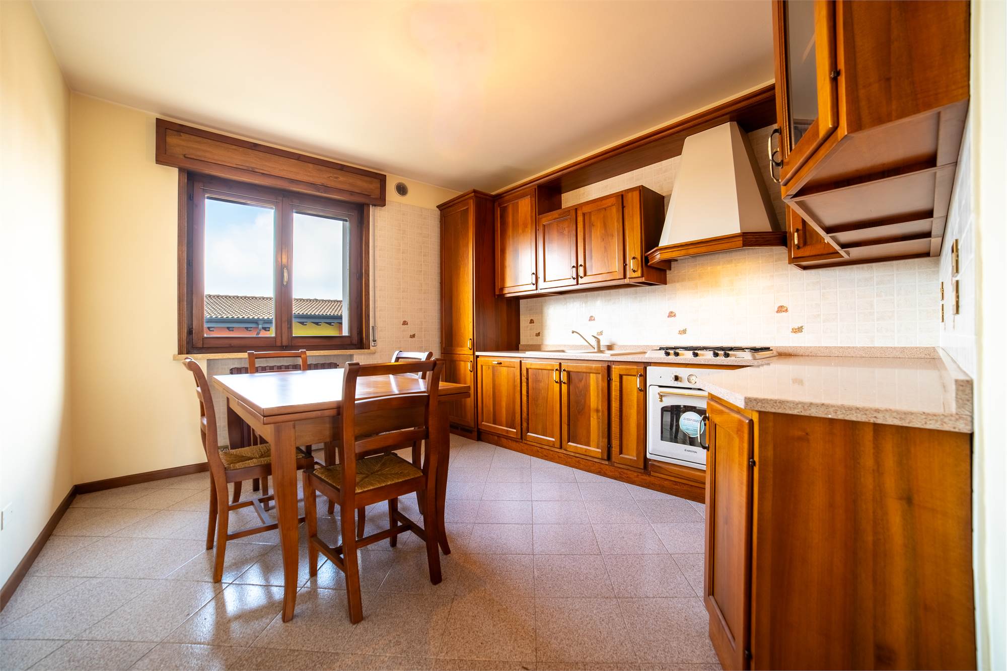 La spaziosa zona d'ingresso conduce al soggiorno, ampio e luminoso, con accesso diretto al balcone, perfetto per un caffè al mattino o un momento di relax a fine giornata. La cucina è separata e abitabile, uno spazio vero da vivere ogni giorno, non un semplice angolo cottura.